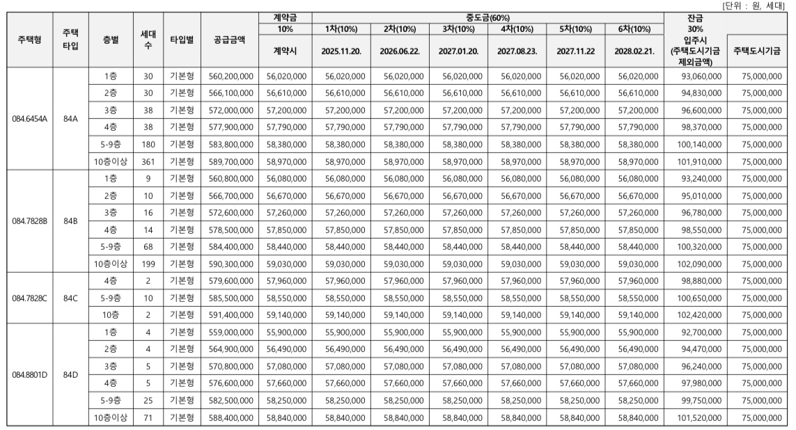 | 84㎡ | 공공분양 (국민주택) | 1,121세대 | 약 5.6억~5.9억 |